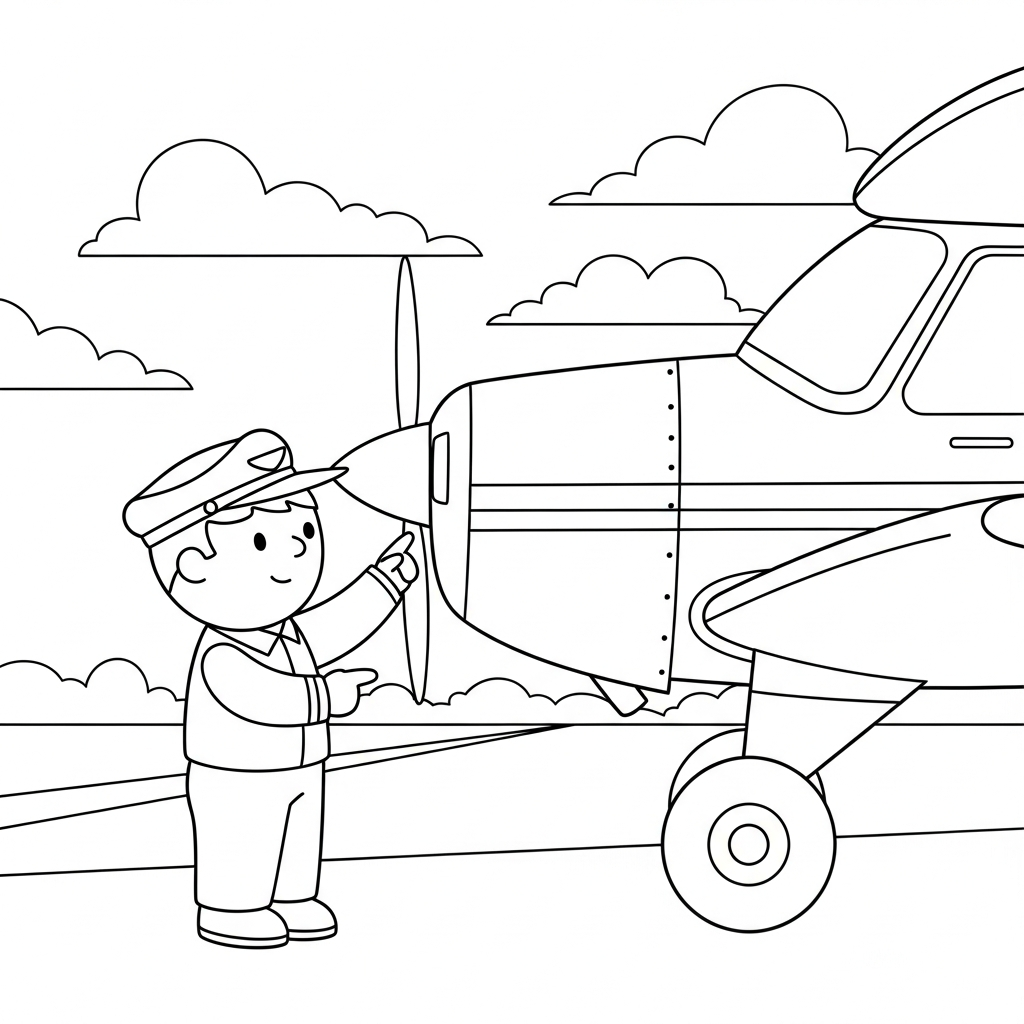Lade diese einfache Farbseite eines Piloten bei der Vorflugkontrolle herunter und drucke sie aus. Ideal für Kinder und macht Spaß beim Ausmalen zu Hause oder im Unterricht.