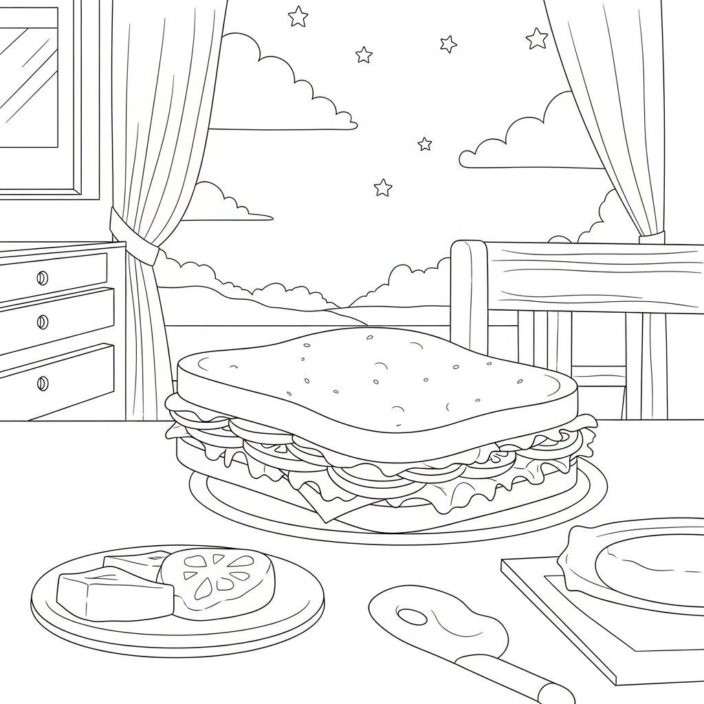 Lade diese kinderfreundliche Malvorlage mit einem einfachen Sandwich am Familientisch herunter und drucke sie aus. Ideal für zu Hause oder im Unterricht!