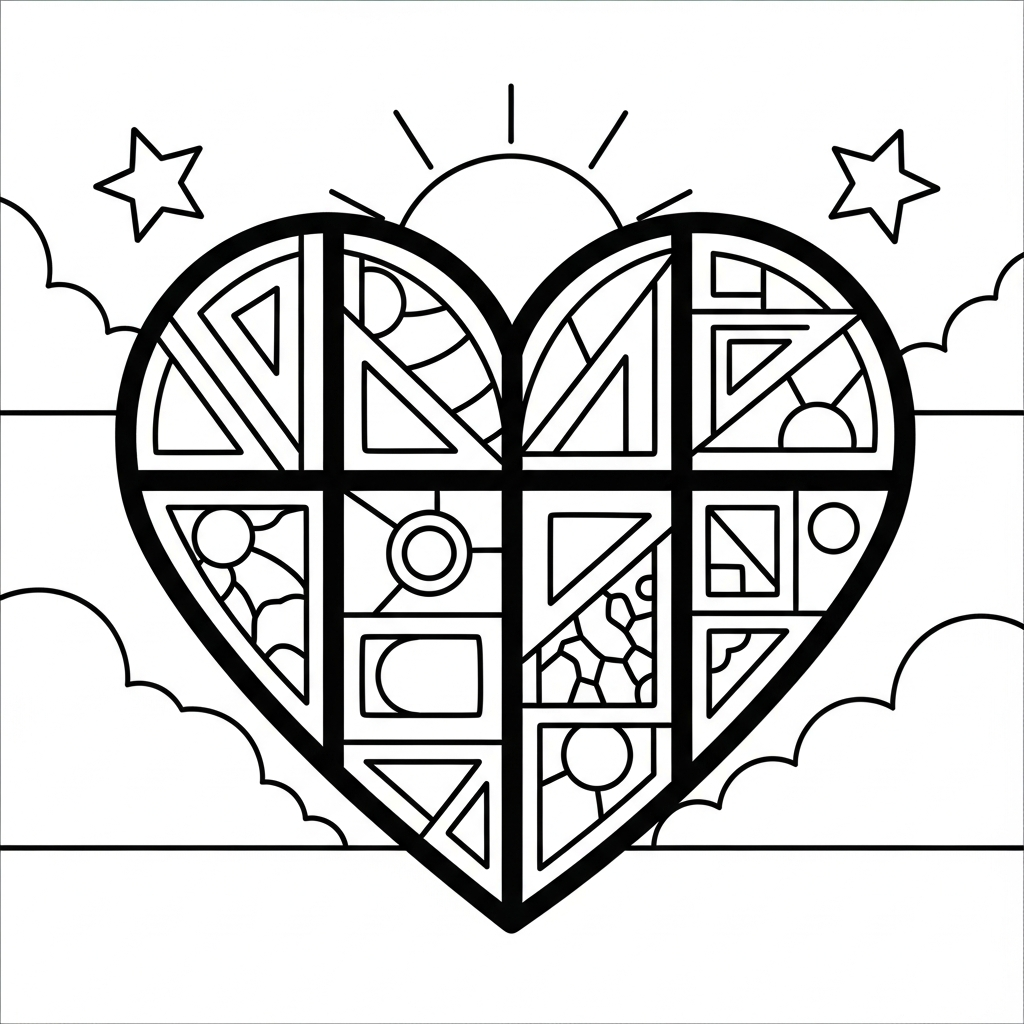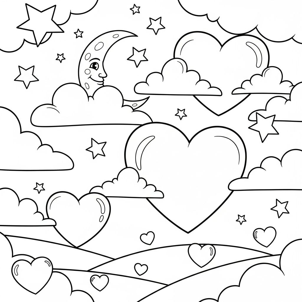 Mittelgroßes Cartoon-Herz-Muster mit Himmel-Mond und Sternen Ausmalbild