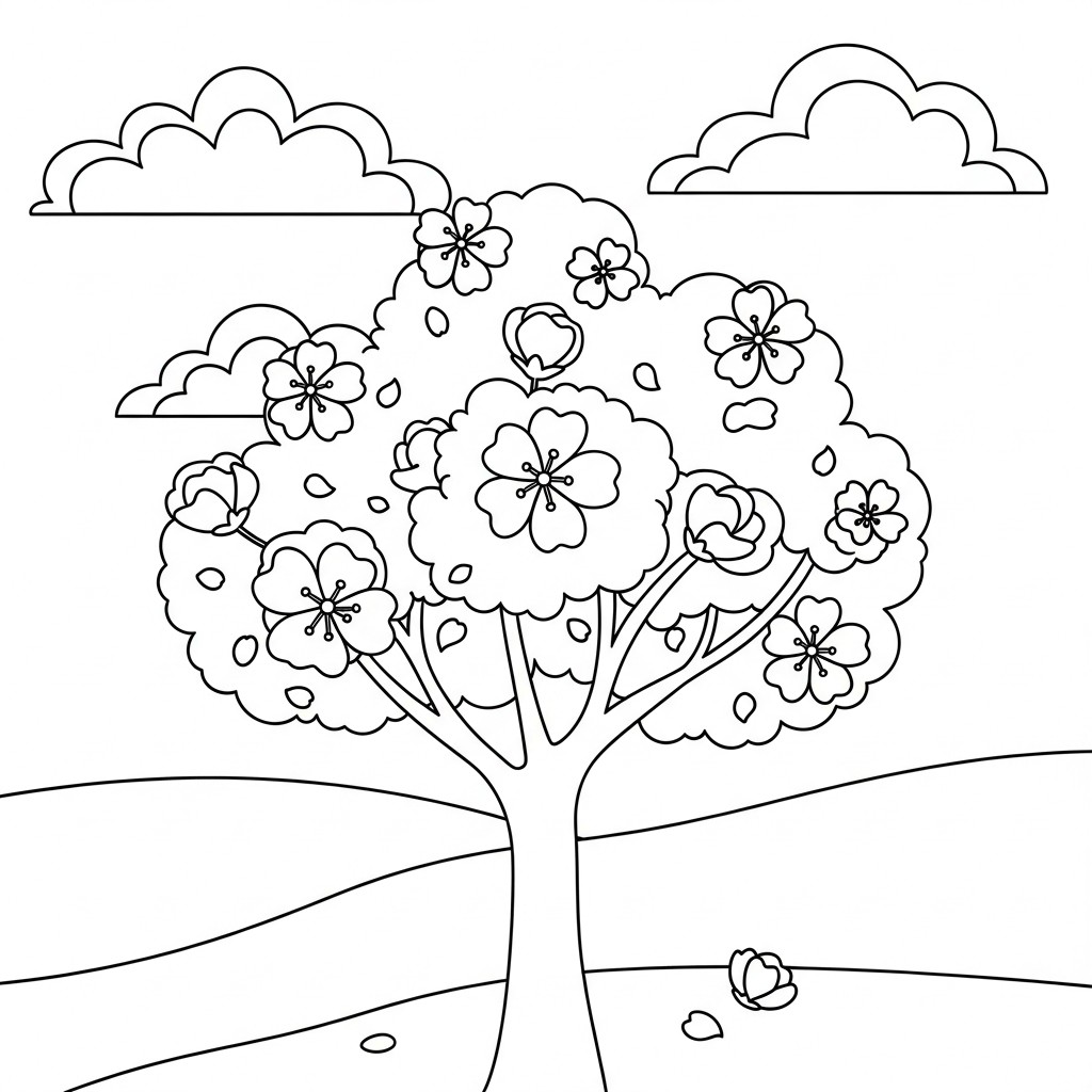 Einfache, blühende Kirschbaum-Ausmalbild unter einem sonnigen Himmel