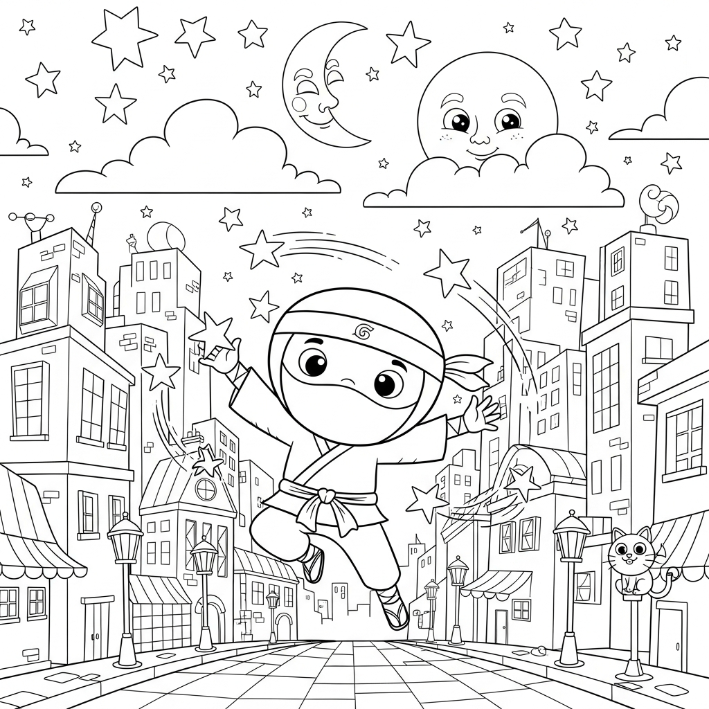 Fun Medium Cartoon Ninja Coloring Page with Throwing Stars