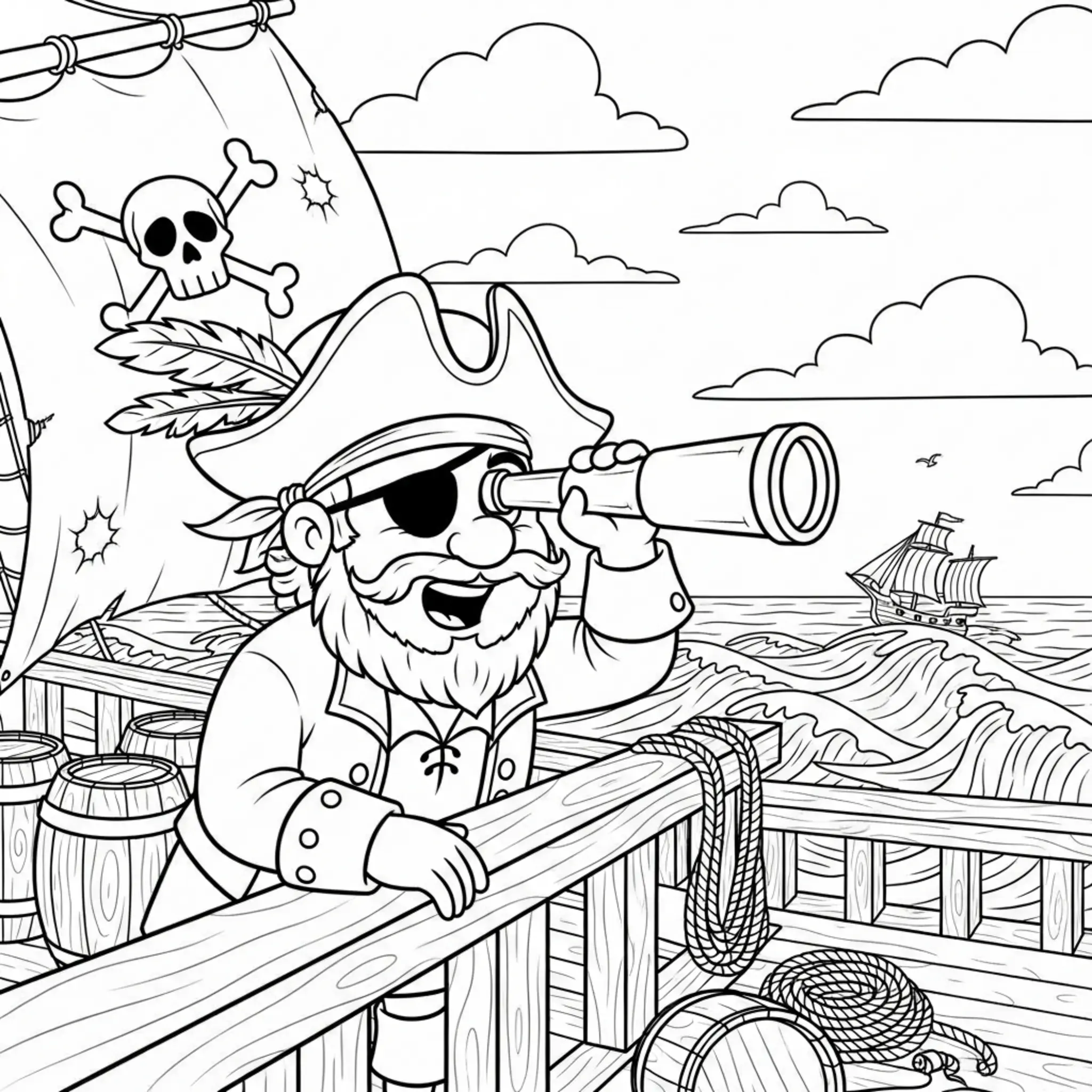 Medium Cartoon Pirate Captain Spotting Enemy Ship Coloring Page