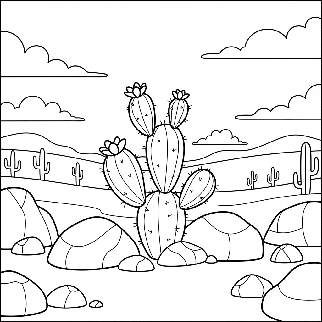 Cartoon Cactus Coloring Page Among Rocks