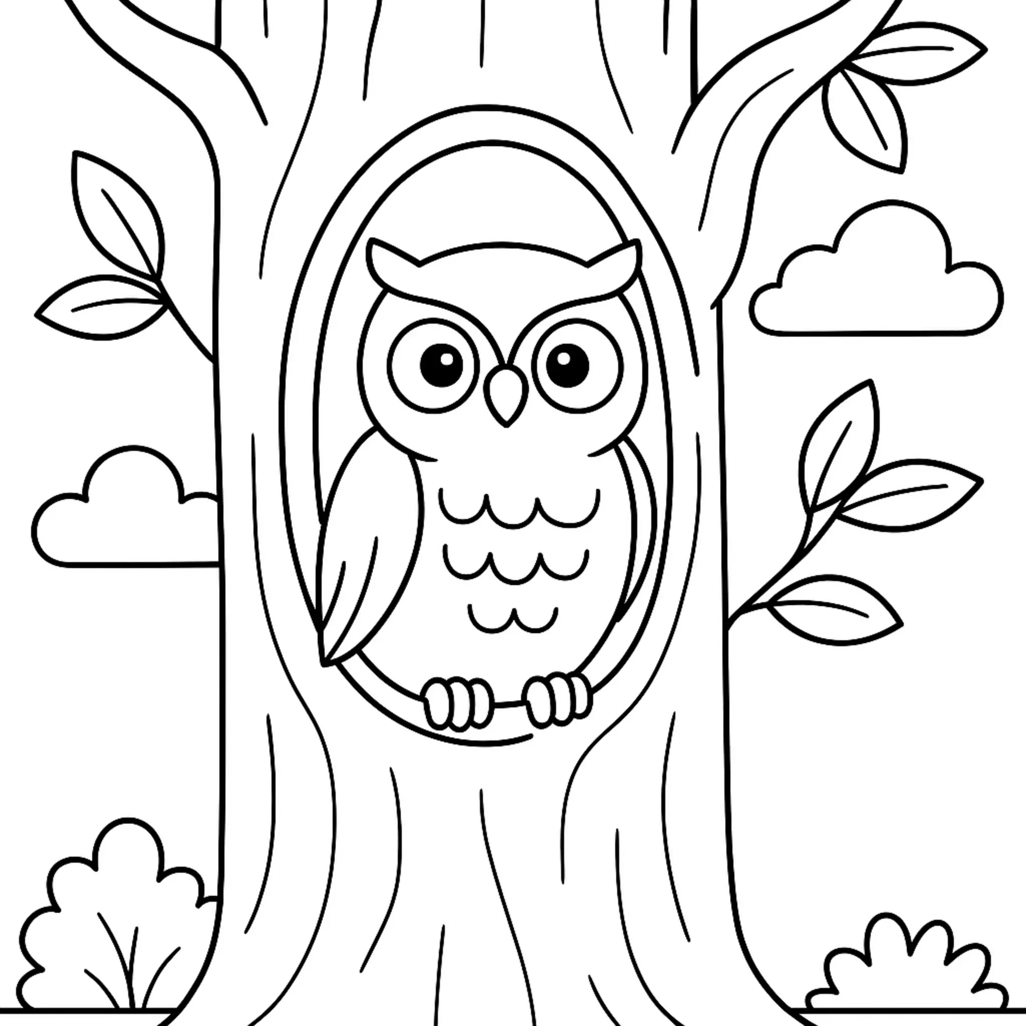 El búho, con sus grandes y curiosos ojos, asoma desde el hueco del árbol, mientras hojas vibrantes flotan suavemente a su alrededor. Esta escena encantadora transmite un sentido de asombro, facilitando que los niños den vida a sus propios colores. Su diseño simple garantiza que incluso los más pequeños puedan participar con confianza en este proceso creativo. La facilidad de colorear proporciona una experiencia relajante, fomentando la creatividad sin frustraciones.