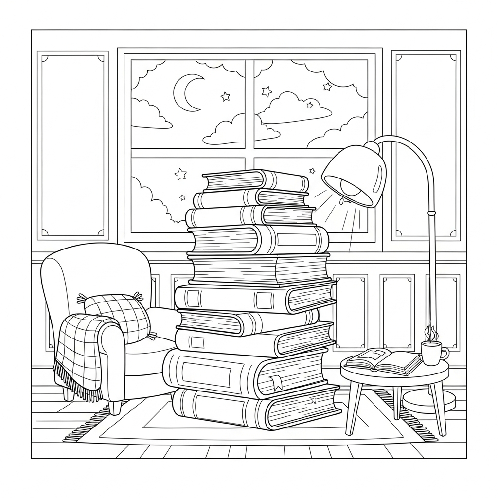 Montón de Libros en un Acogedor Rincón de Lectura para Colorear