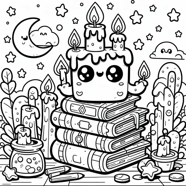 Página para Colorear de Montón de Libros de Caricatura Mediana con Velas