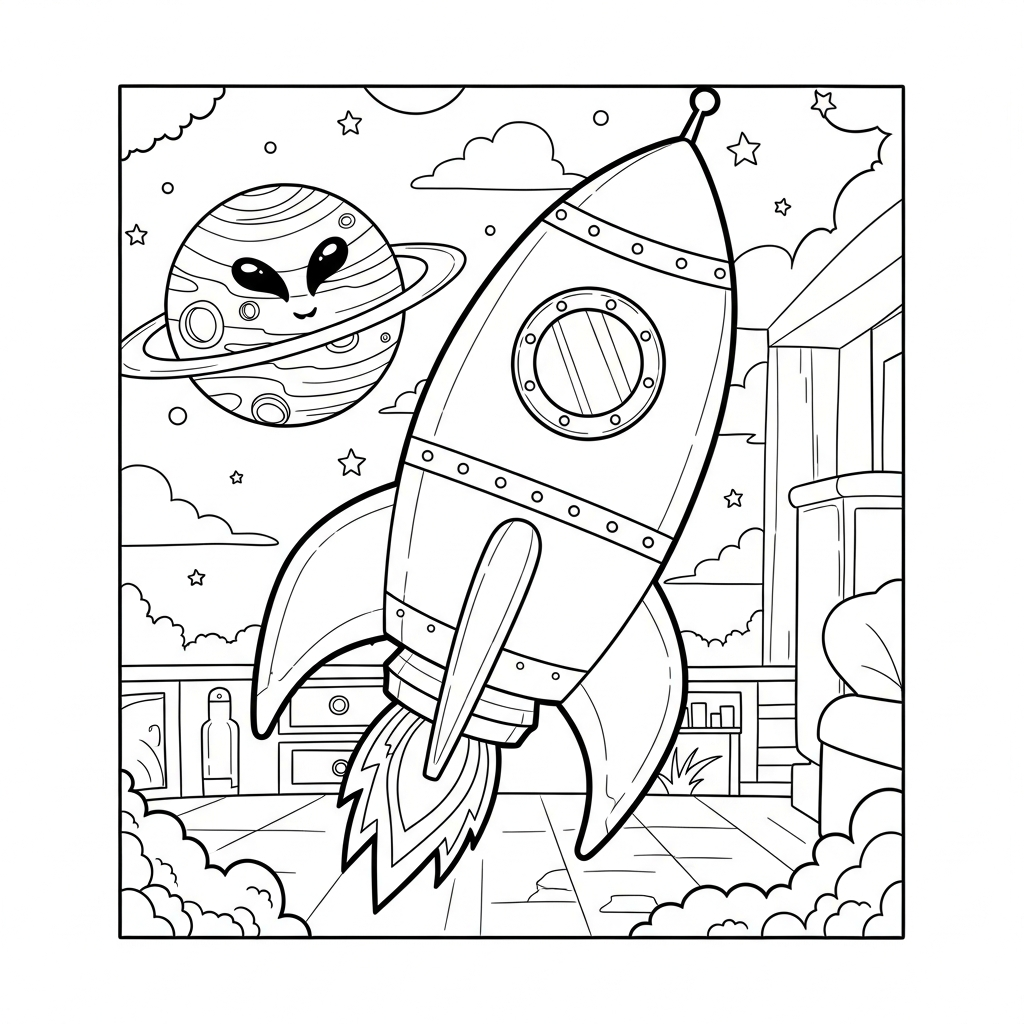 Página para Colorear de un Cohete Cartoon Mediano Junto a un Planeta Extraterrestre