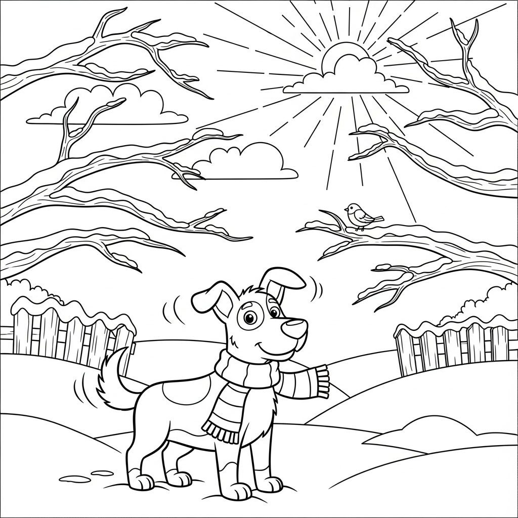 Página para Colorear de Perro de Caricatura Mediano con Bufanda en un Jardín Cubierto de Nieve