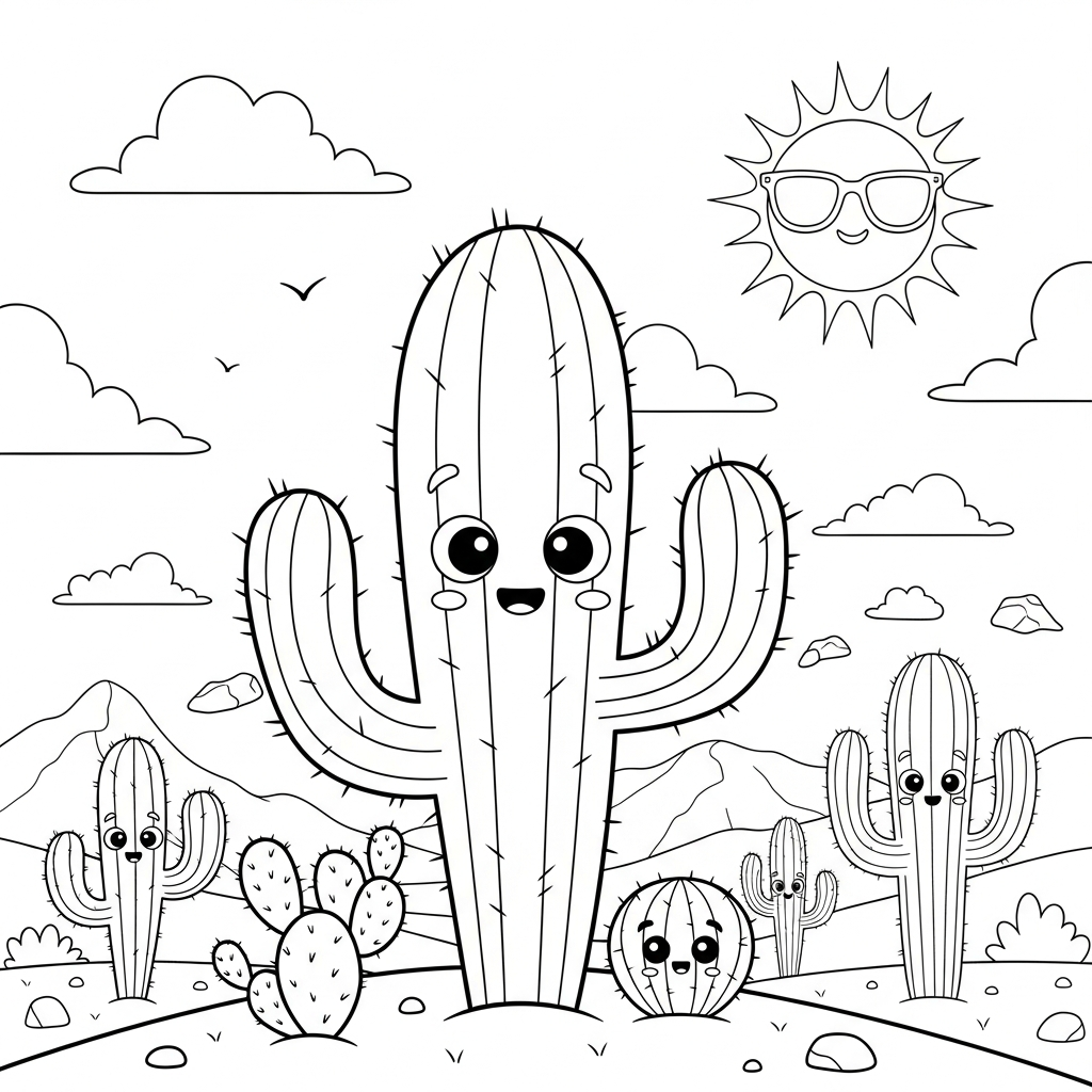 Descarga e imprime esta divertida página para colorear de cactus del desierto en estilo cartón mediano. Ideal para niños y divertida para colorear en casa o en clase.