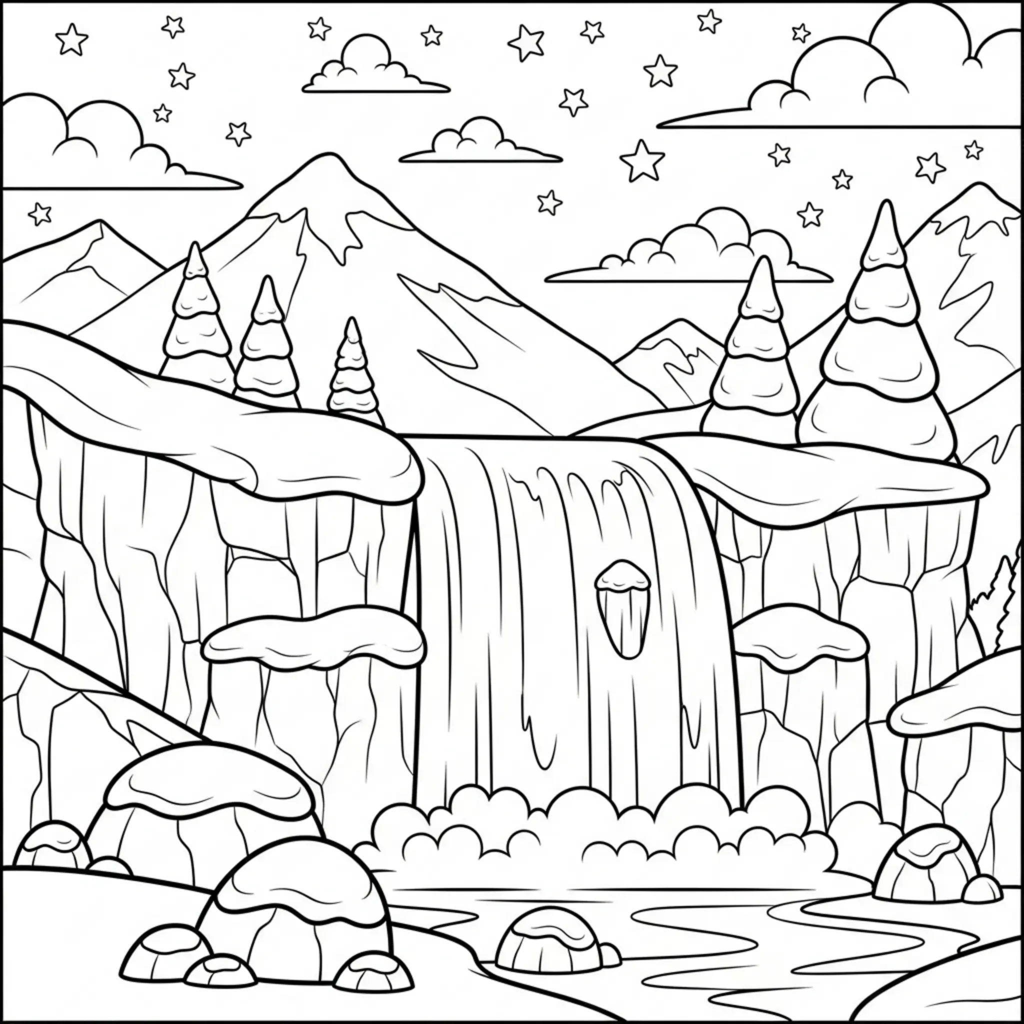 Descarga e imprime esta página para colorear de cascada en escena de montañas nevadas. Perfecta para los niños y entretenida para colorear en casa o en clase.