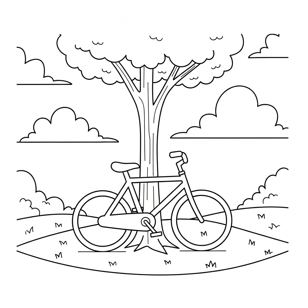 Descarga e imprime esta página para colorear de una bicicleta apoyada en un árbol. Ideal para niños y divertida para colorear en casa o en clase.