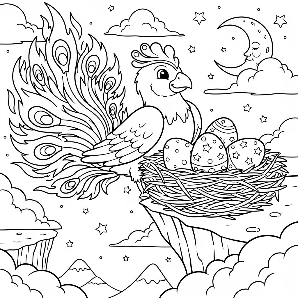 Plongez dans l'univers magique de notre page de coloriage représentant un phoenix, symbole de renaissance et de puissance. Ce dessin captivant montre un phoenix vibrant veillant sur un nid rempli d'œufs dorés, offrant une expérience artistique unique. Téléchargez et imprimez cette page pour laisser libre cours à votre imagination avec des couleurs éclatantes!
