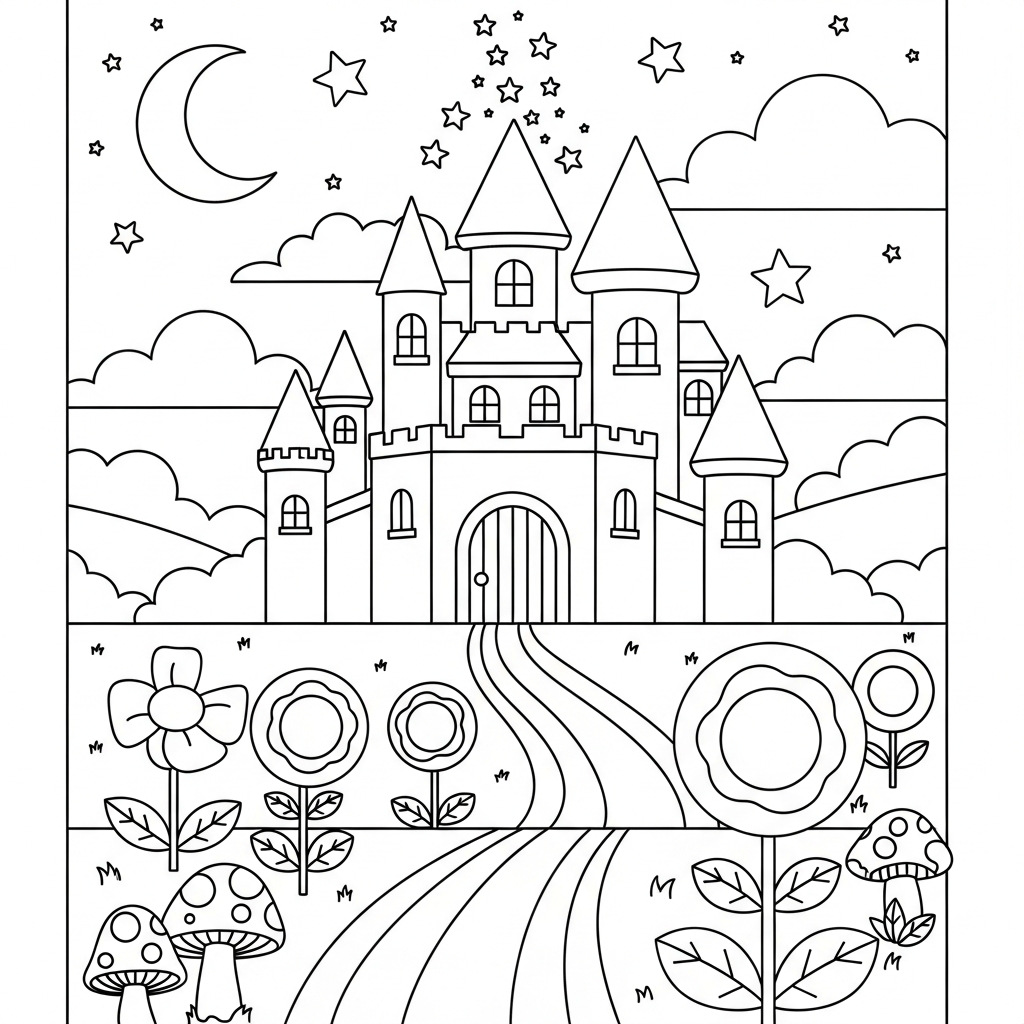 Facile Disegno da Colorare di un Castello Incantato con Giardino Magico