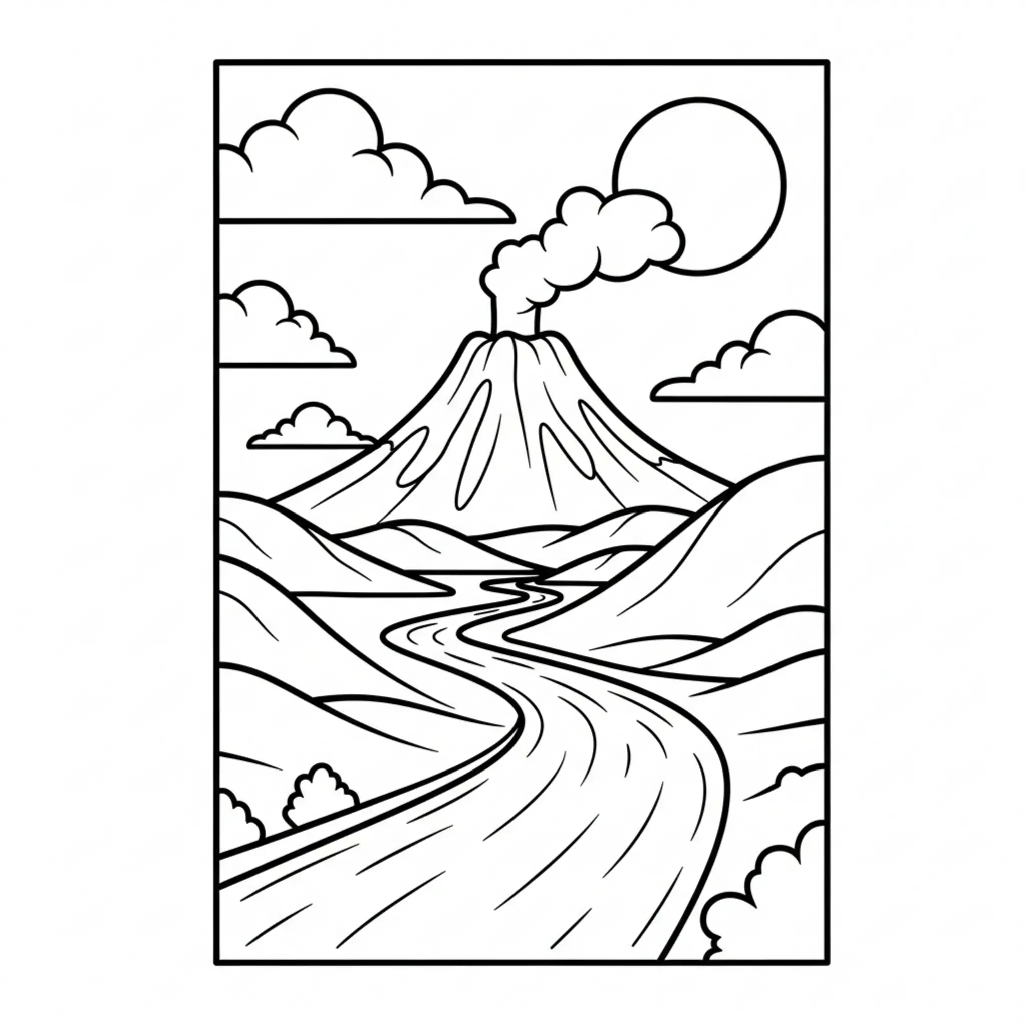 Scarica e stampa questa pagina da colorare facile con vulcano e valle del fiume. Perfetta per bambini, ideale per colorare a casa o in classe.