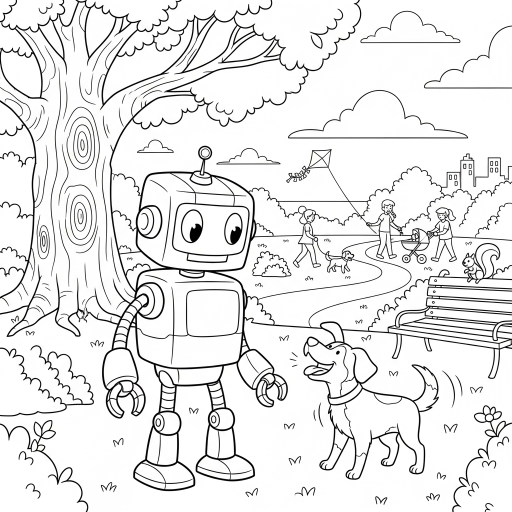 Scarica e stampa la nostra pagina da colorare con un robot cartoon e un cane al parco. Perfetta per i bambini e ideale per colorare a casa o a scuola.