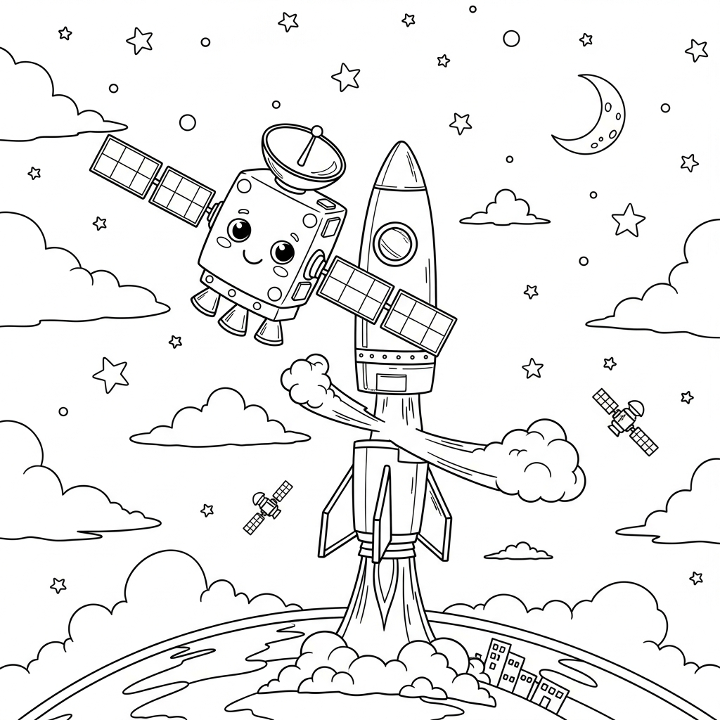 Laat je creativiteit de vrije loop met deze spannende kleurenpagina! Deze schattige satelliet, die net vanuit een raket is gelanceerd, biedt urenlang kleurplezier voor kinderen en ruimtefans.