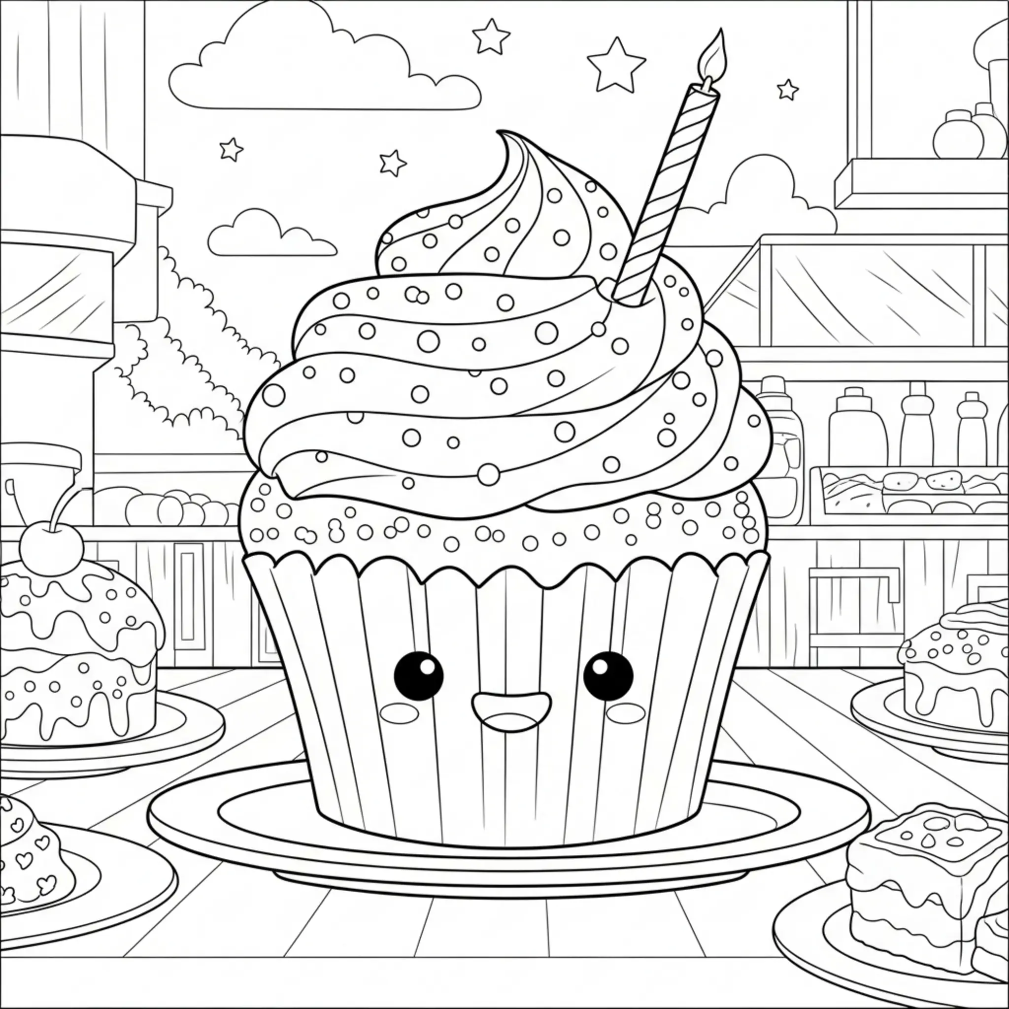Desenho para Colorir: Cupcake Cartoon Médio na Mesa de Buffet de Aniversário