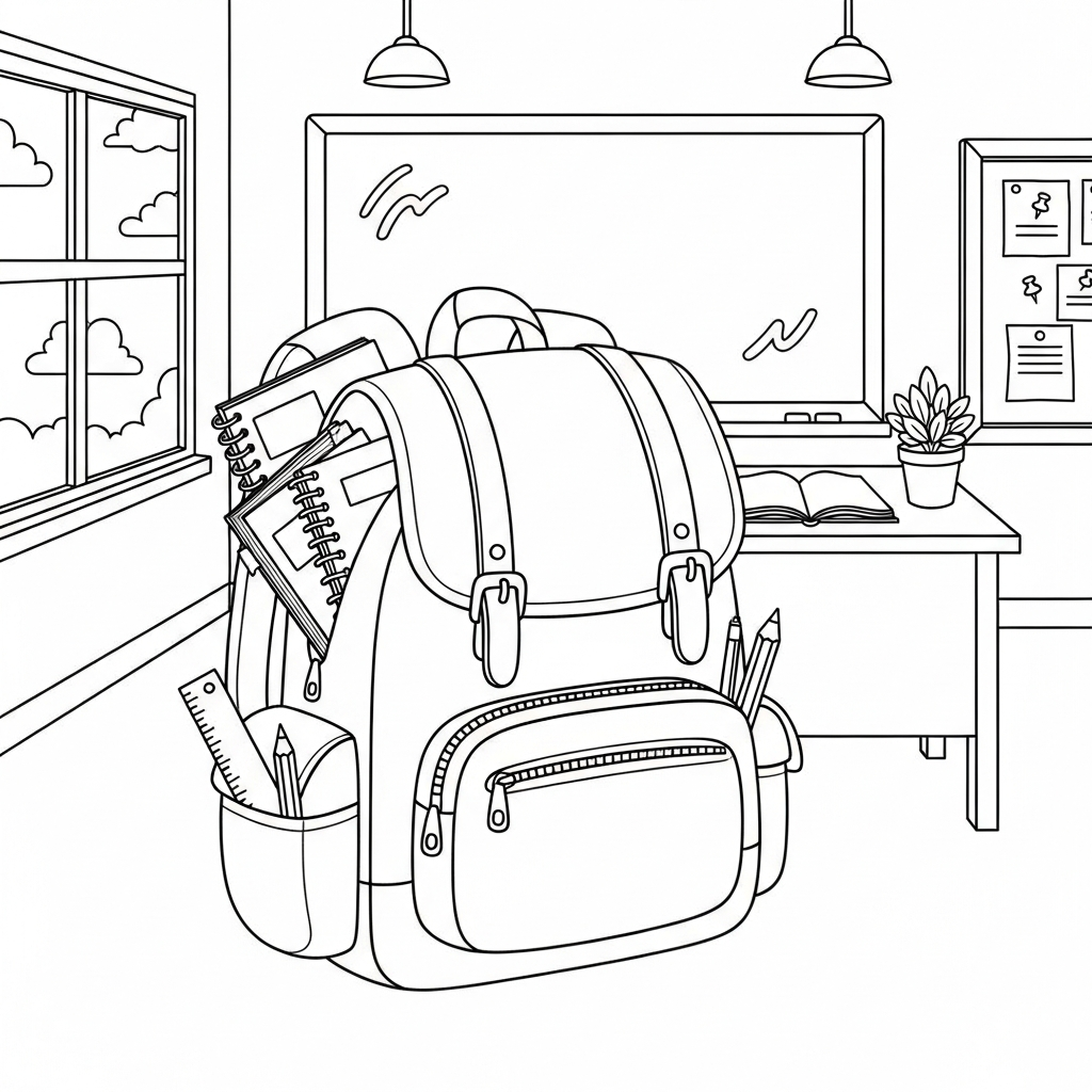 Página para Colorir Mochila de Estudante em Estilo Cartoon com Cadernos e Lápis
