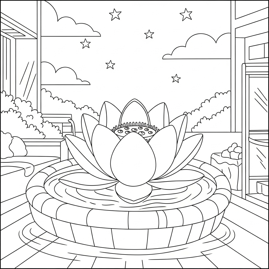 Página de Colorir de Lótus Simples na Fonte do Jardim