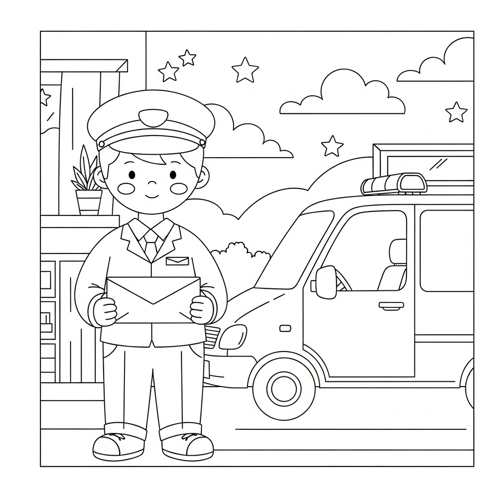 Página para Colorir do Carteiro ao Lado de uma Van Postal