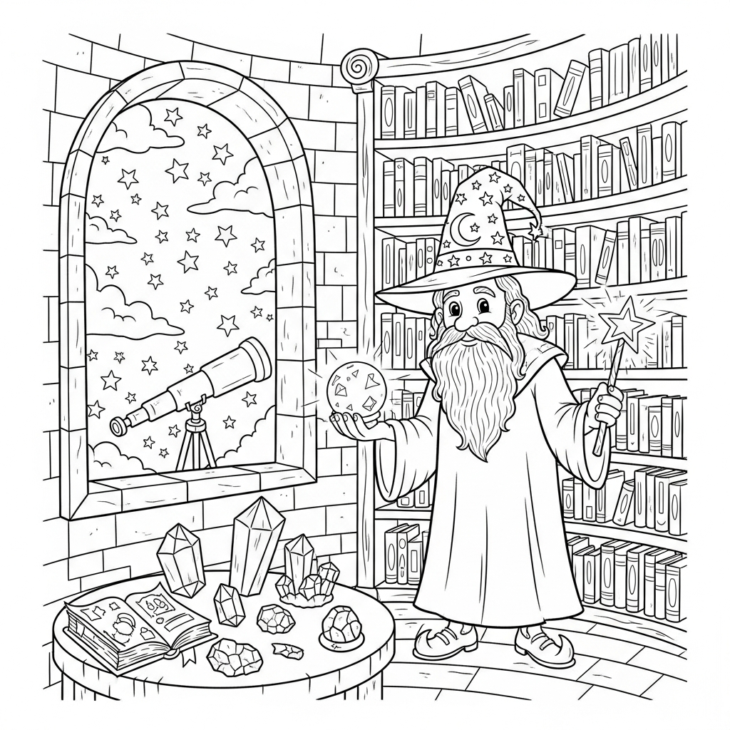 Páginas para Colorir: Mago Médio em Uma Torre com Estrelas e Cristais
