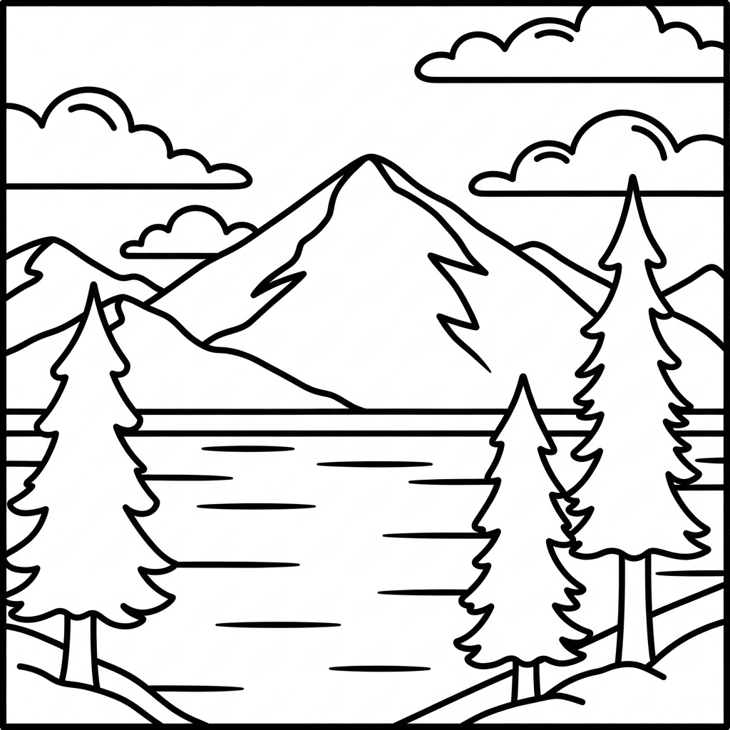 Baixe e imprima esta página para colorir de lago de montanha simples com pinheiros. Perfeita para crianças e divertida para colorir em casa ou na escola.
