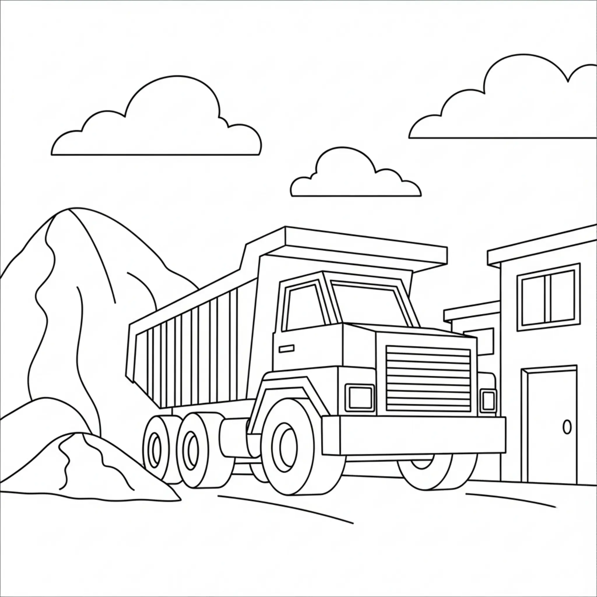 Faça o download e imprima este desenho de caminhão basculante em obras. Ideal para crianças se divertirem colorindo em casa ou na escola.
