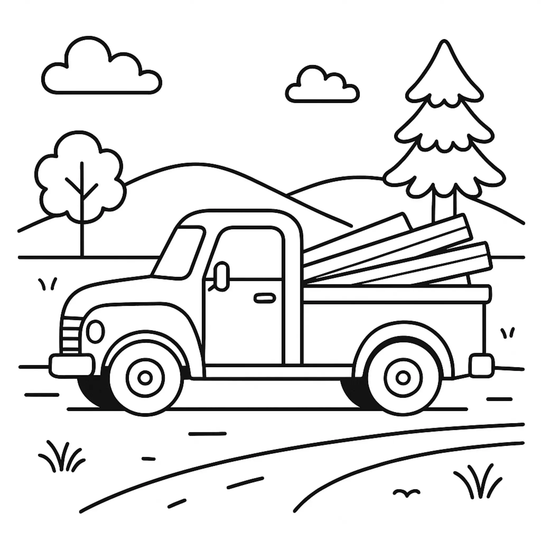 Baixe e imprima este desenho de caminhonete simples carregada de madeira. Ideal para crianças e divertido para colorir em casa ou na escola.